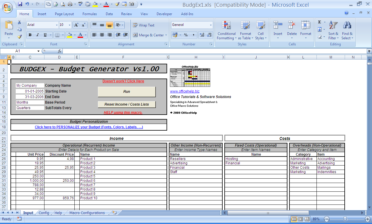 Create your own Budget files without writing a single formula for Excel. Just define the Income & Cost categories and click the Run button.