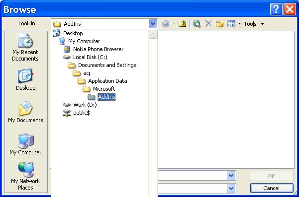 Instead of finding the default folder and copying the file there, you may instead tell Excel that there is an Add-In somewhere else on the harddisk (or even on a network disk). Click on the “Browse” button, select the folder where the file is located and select it. Click “OK” and the file will be immediately added to the list.
