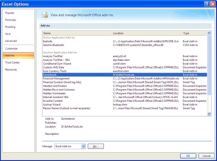 The above menu entries (depending on version) will both open a Pop-Up windows where you can activate / deactivate any AddIn Excel is currently aware of by checking / unchecking its respective checkbox: